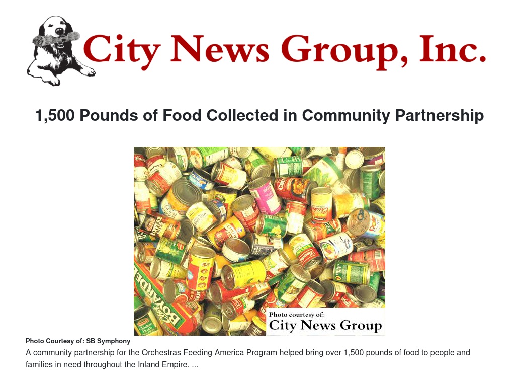 "We are pleased to have participated with the San Bernardino Symphony and the Orchestras Feeding America program for the past seven years. It is a perfect fit," said Ferguson. "We are able to collect the food and the Symphony is able to reach out and give it to organizations in the community who need it."