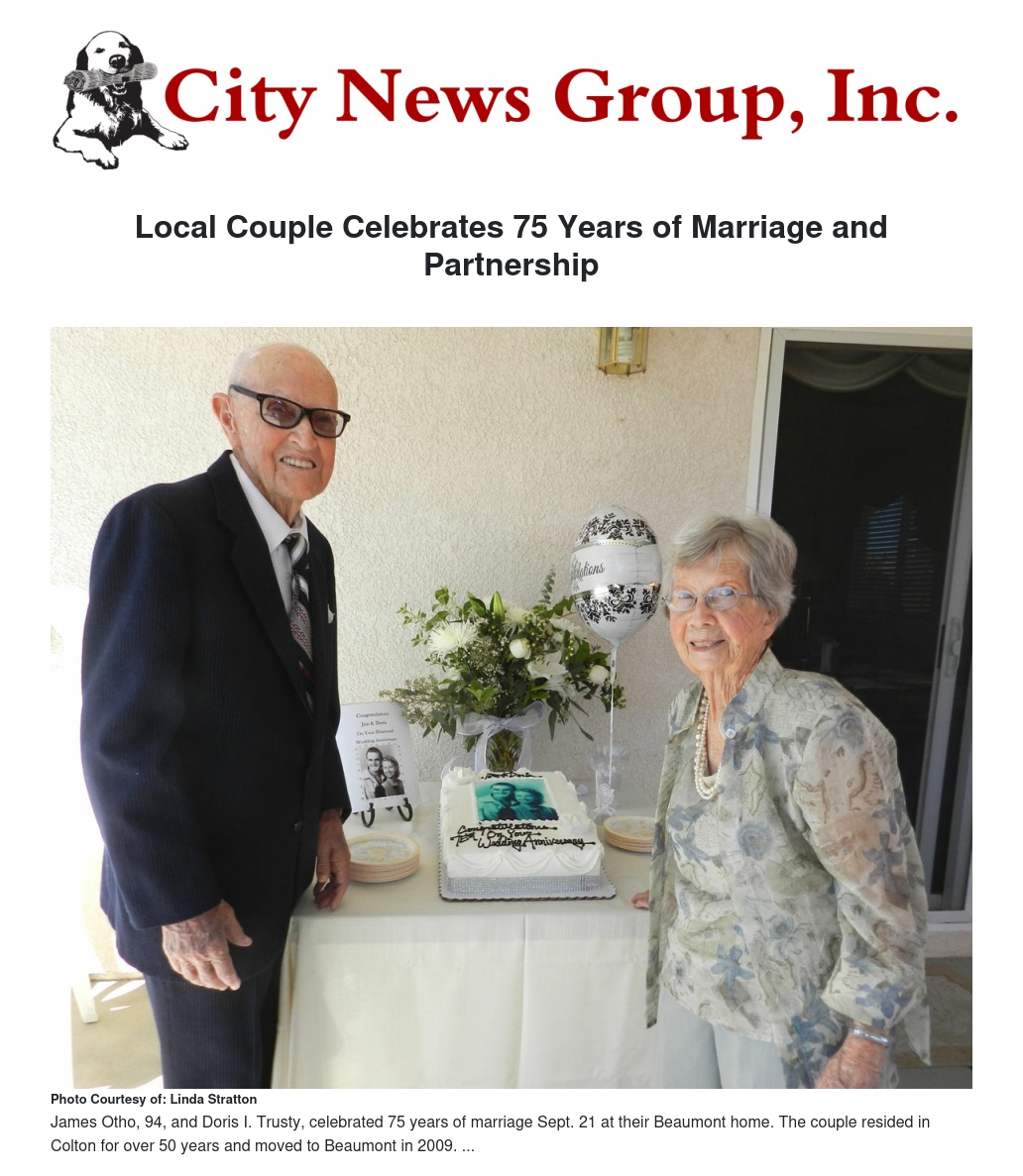 The couple was married at the Nazarene Church in Colton on Oct. 16, 1939 just before the United States became involved in WWII. Throughout their marriage they resided in the Inland Empire. They moved to Beaumont in 2009, previously residing in Colton for 54 years. During their marriage they also lived in Bloomington and Redlands.