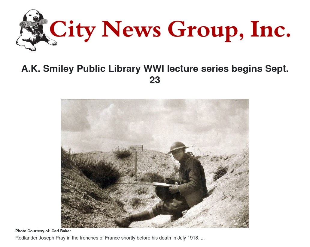 A.K. Smiley Public Library WWI lecture series begins Sept. 23