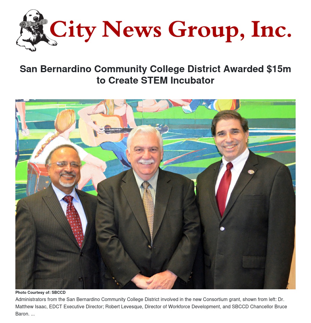 The grant will be used to create the STEM Education Business Incubator (SEBI) Center. STEM is the acronym for Science, Technology, Engineering and Math. Located at California Steel Industries in Fontana, the SEBI will serve the areas of Rancho Cucamonga, Norco, Barstow, Palm Desert, San Jacinto, Victorville, San Bernardino, Yucaipa and Riverside cities in both San Bernardino and Riverside Counties.
