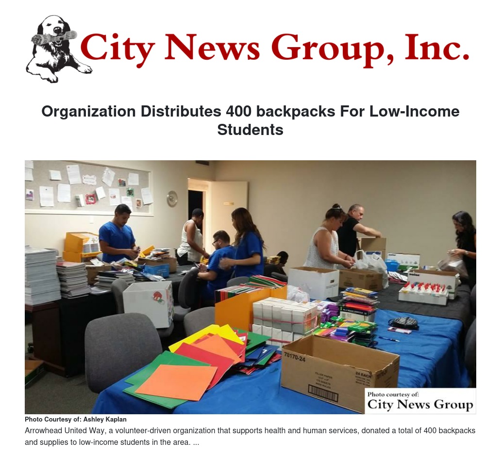 SAN BERNARDINO>> To help low-income students start the school year on a track to succeed Arrowhead United Way, a volunteer-driven organization that supports health and human services, donated a total of 400 backpacks to the San Bernardino, Rialto and Colton School Districts.