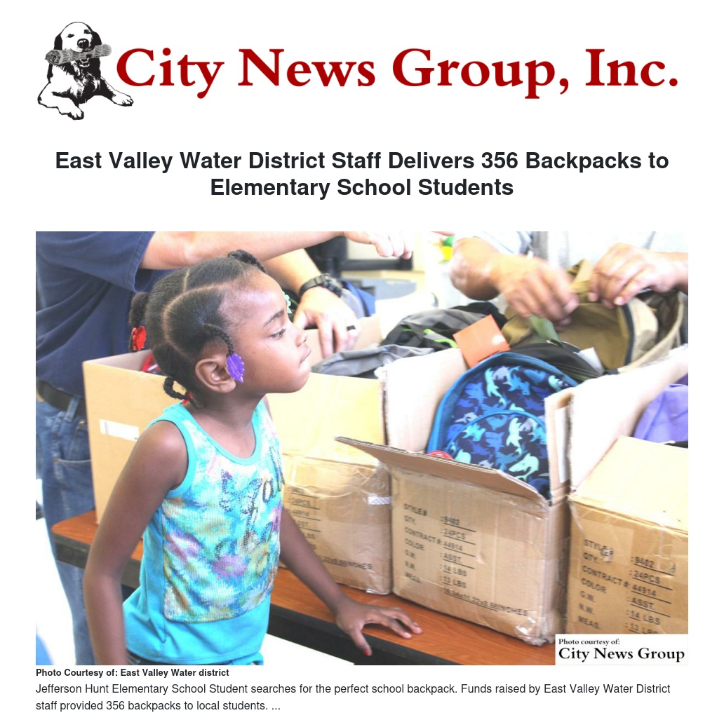 East Valley Water District welcomed students during the first day of school at Jefferson Hunt Elementary with new backpacks and school supplies. District employees raised funds to donate 356 backpacks to students who might not otherwise be able to afford these school necessities.