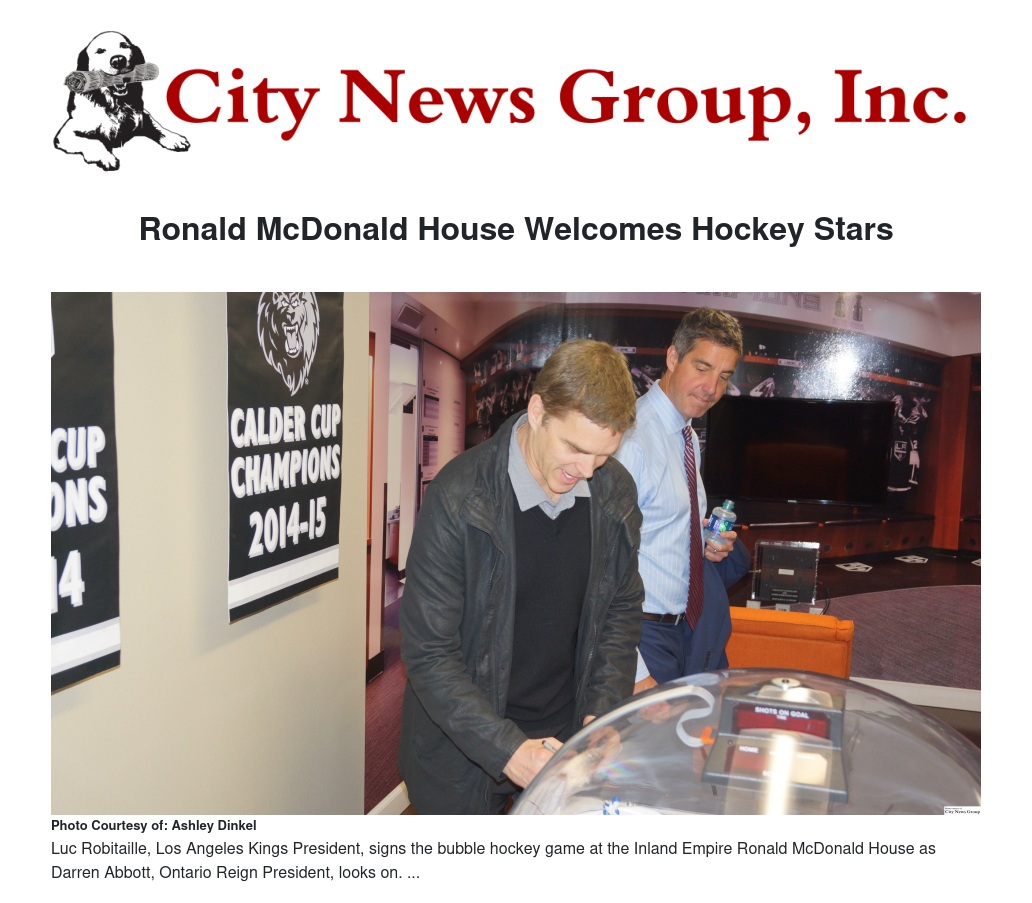 LOMA LINDA>> On Wednesday, March 22, the Inland Empire Ronald McDonald House welcomed Los Angeles Kings President Luc Robitaille and Ontario Reign President Darren Abbott for a dedication ceremony of the Family Activity Center, an area that houses many Kings and Reign decor.