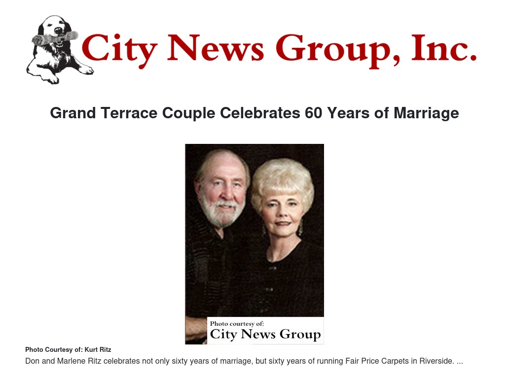 GRAND TERRACE>> Friday, June 10 marks the 60th anniversary of Don and Marlene Ritz of Riverside. The couple celebrates not only sixty years of marriage, but sixty years of running Fair Price Carpets in Riverside.