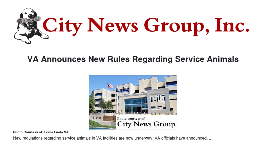 On Monday, Aug. 17, the Department of Veterans Affairs (VA) announced it has revised its regulation regarding the presence of animals on VA property. The updated regulation will ensure VA practices remain consistent with applicable federal law, according to a release issued by the Department of Veterans Affairs. Officals say it will also assist individuals entering VA facilities in developing a clear and consistent understanding of the criteria governing facility access for service animals.
