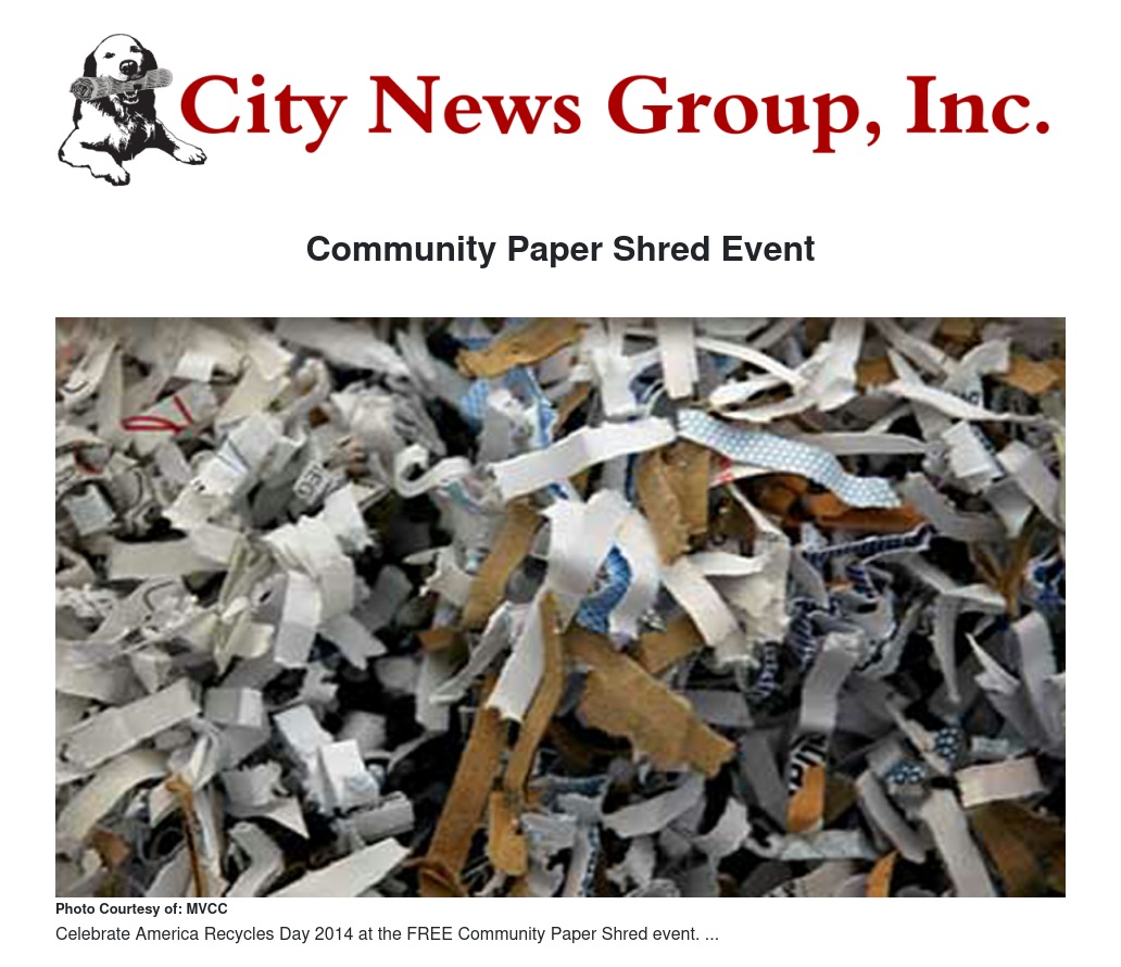 The City of Moreno Valley is celebrating America Recycles Day 2014 by hosting a FREE Community Paper Shred event on Saturday, Nov. 15 from 9 a.m. to 1 p.m. or until the truck containing shredded material becomes full.