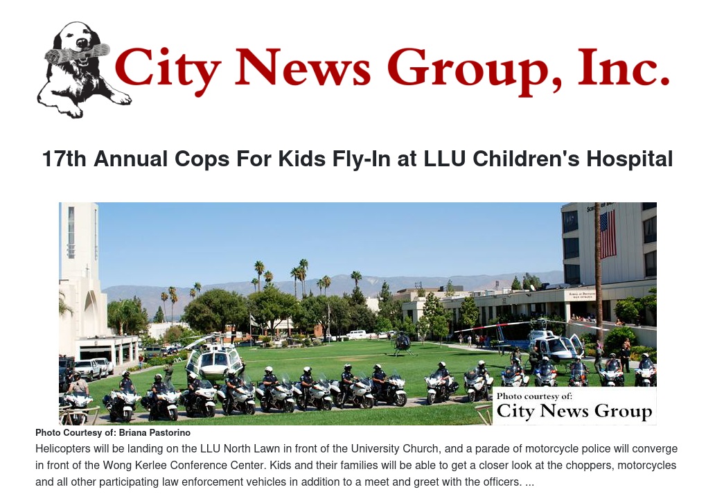 Police helicopters and a parade of police motorcycles and cars are set to make their way to Loma Linda University Children’s Hospital (LLUCH) at the 17th Annual Cops for Kids Fly-In Tuesday, Oct. 20. Several law enforcement officers, as well as aviation and air support programs from all over Southern California are expected to participate in the event, which will start at 11 a.m. The Fly-In will be location on the LLU North Lawn near LLU Church, 11125 Campus Street. Parking is available in the parking structure on Campus Street.