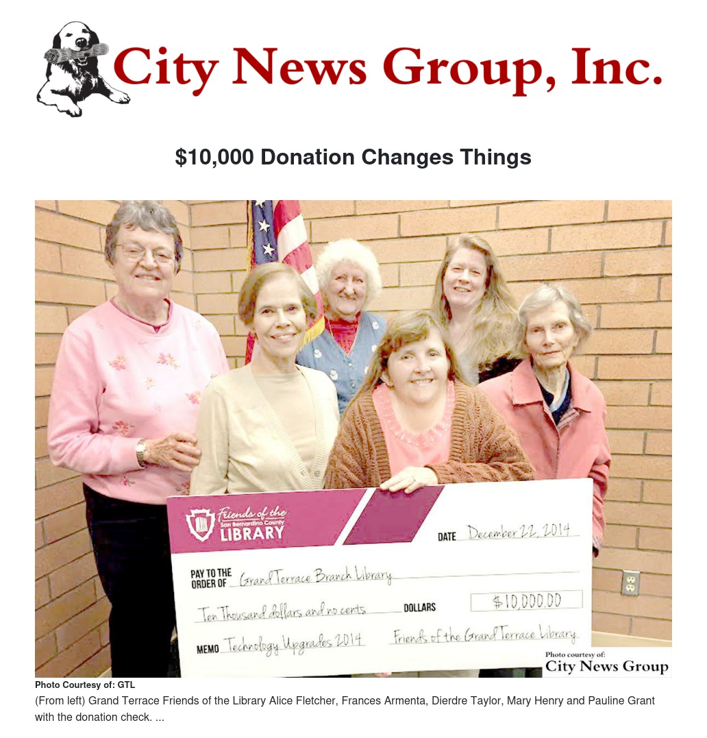 The Friends of the Grand Terrace Library recently donated $10,000 for the purchase of new computers and technology enhancements at the Grand Terrace Branch Library.