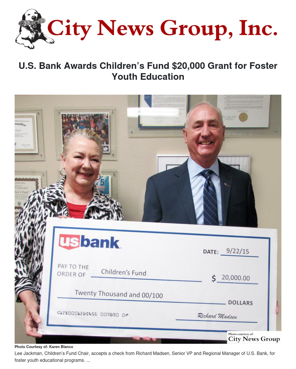 U.S. Bank Foundation has approved and presented $20,000 for Children’s Fund Foster Youth Educational Programs, which will empower foster and former foster youth through higher education.