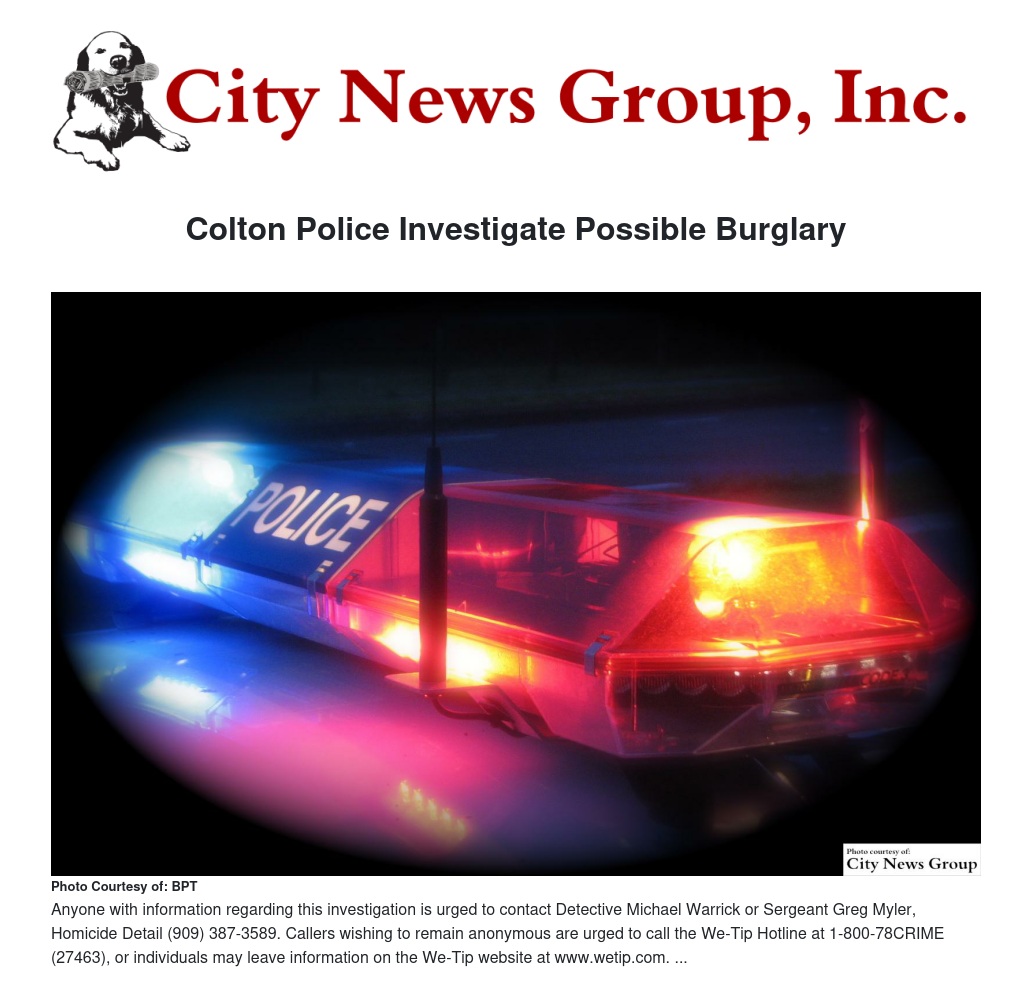 COLTON>> Colton Police Officers responded to a possible residential burglary in progress in the 1200 block of William McGrath Street on Tuesday, Dec. 27, 2016.