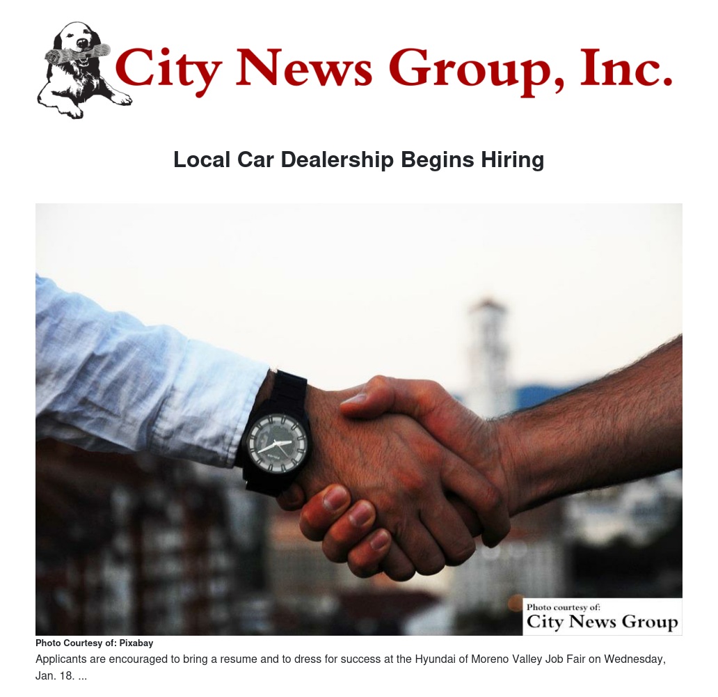 MORENO VALLEY>> Hyundai of Moreno Valley will hold a job fair on Wednesday, Jan. 18 to recruit for approximately 35 positions at its newest flagship dealership which is expected to open in February.