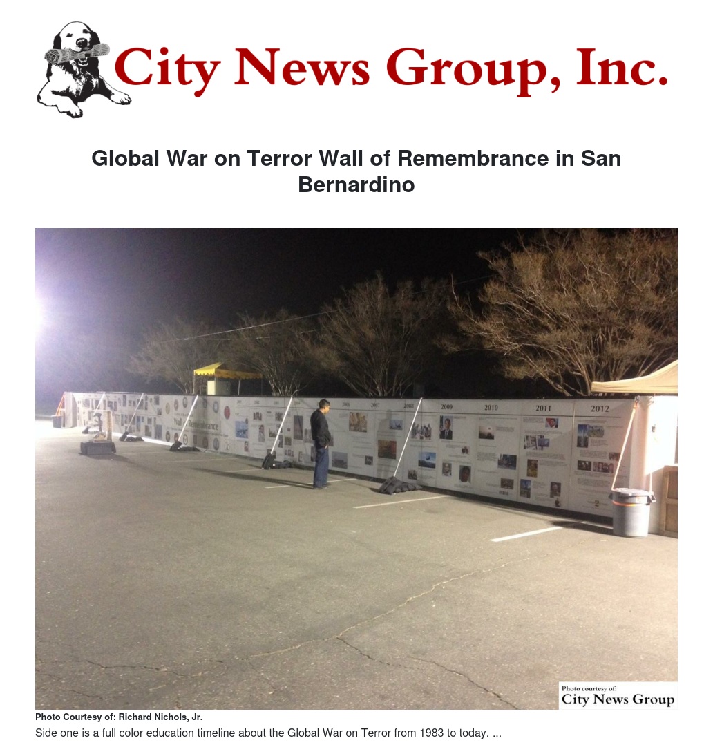 “Panel 31 of the Global War on Terror Wall of Remembrance was unveiled in San Bernardino a few weeks ago in a ceremony honoring the 14 killed and the 22 who were wounded,” said Richard Nichols, Jr., director and chairman.