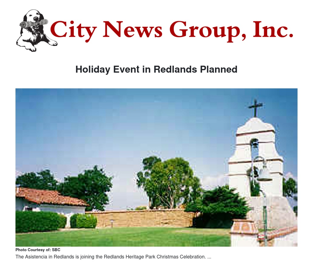 The Asistencia in Redlands is joining with their neighbors for the Redlands Heritage Park Christmas Celebration on December 6 from 10 a.m. to 5 p.m. The Asistencia was established in 1819 as part of the Mission San Gabriel’s Rancho San Bernardino. The ranch buildings were in ruins when they were acquired by San Bernardino County; restoration as an asistencia took place between 1926 and 1937. It is recognized as California State Historical Landmark #42. During the celebration, admission to the Asistencia (regularly $5/adult, $4/senior or military, and $2.50/child) will be half price. Visitors will enjoy tours, decorations, music, hot mulled cider, and crafts and games for children. The Asistencia is at 26930 Barton Road in Redlands; for information, call 909-793-5402.