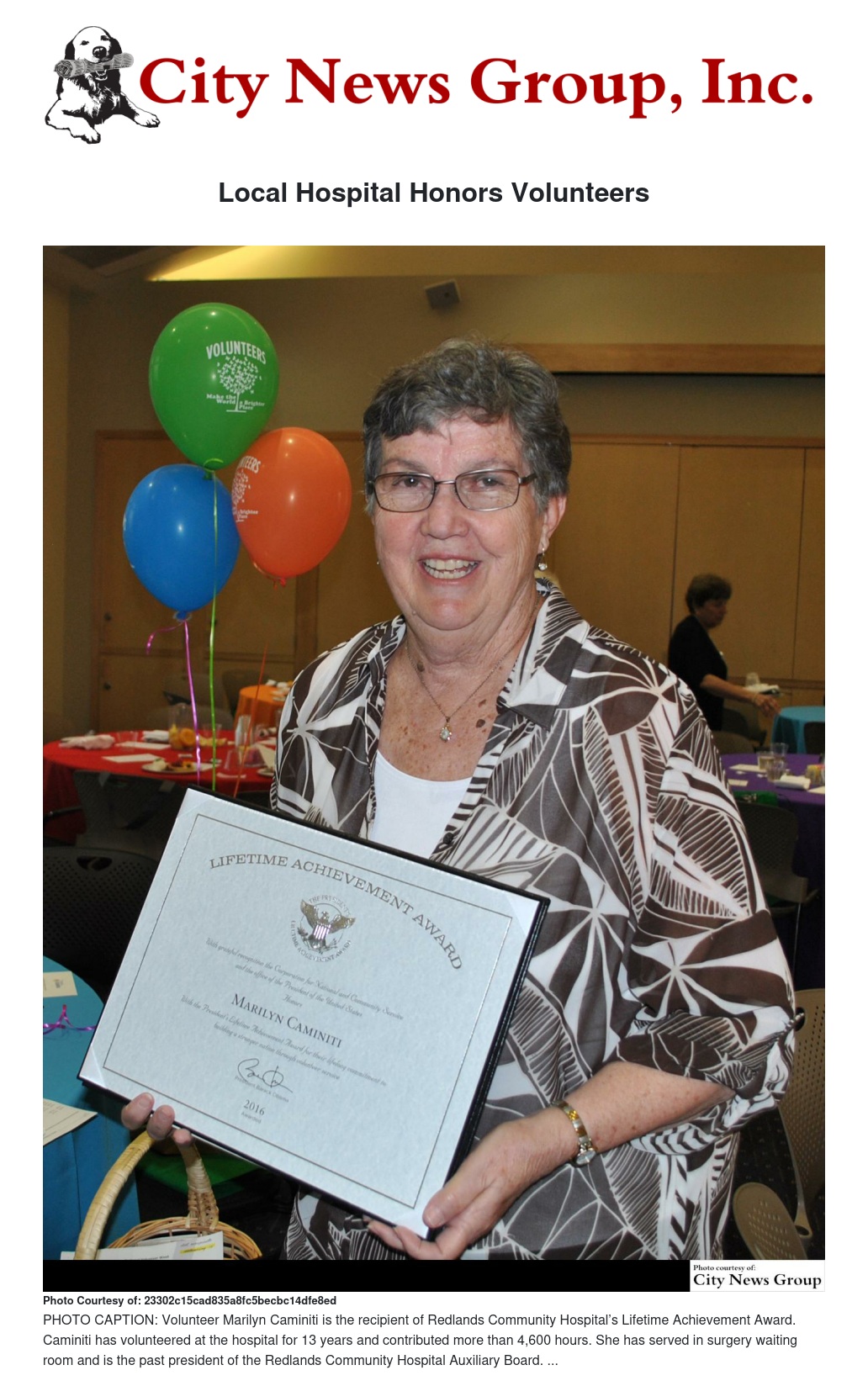 The ceremony honored volunteers with a number of awards to recognize their achievements and hours of service. The recipients of the Presidential Lifetime Award, created to thank and honor Americans who, by their demonstrated commitment and example, inspire others to engage in volunteer service included: Marilyn Caminiti, John Faulkner and Lindsay Collins. Caminiti has volunteered at the hospital for 13 years and contributed more than 4,600 hours. She has served in surgery waiting room and is the past president of the Redlands Community Hospital Auxiliary Board. Serving in the volunteer office, Faulkner has volunteered for seven years and contributed more than 4,300 hours. Serving in maternal child services, Collins has volunteered for three years and contributed more 288 hours.