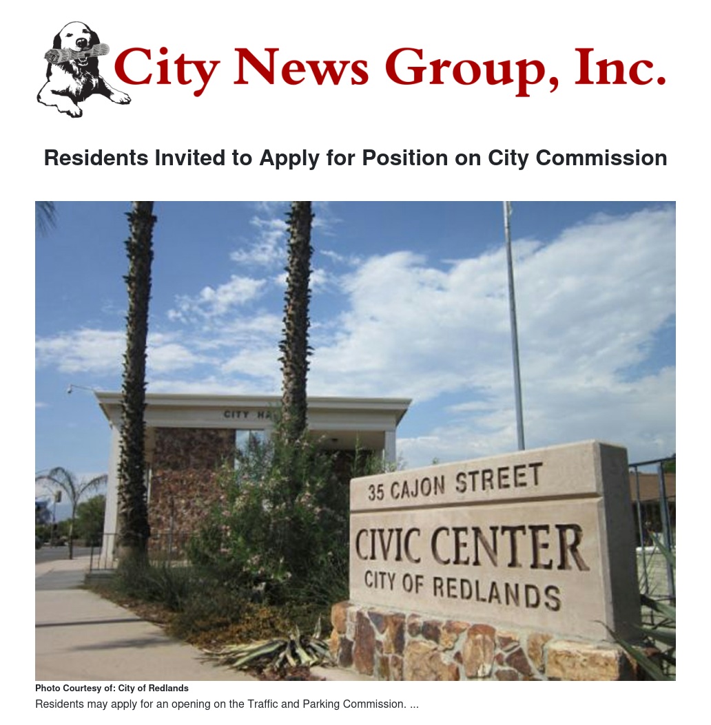 The city of Redlands invites residents to apply for an opening on the Traffic and Parking Commission. Deadline for filing applications is Nov. 26. Members are appointed by the City Council.