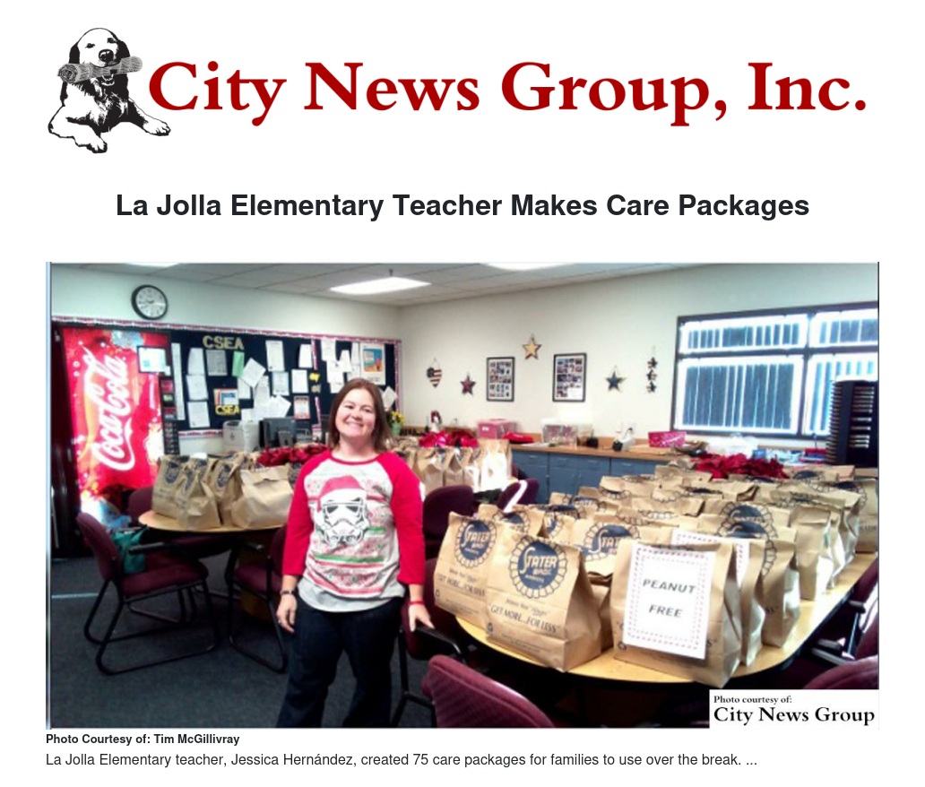 For most students, winter break is a welcome vacation. But for some, it can mean no breakfast or lunch like they get at school. So La Jolla Elementary teacher Jessica Hernández decided to make 75 care packages for families in need to use over the break. She enlisted the help of her sister-in-law, Jennifer Grisham, and her husband, Kevin, who became interested over Thanksgiving when Jessica told them about how some children don’t always have enough to eat during school breaks.