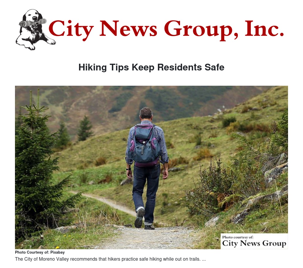 Moreno Valley>> Walking and hiking are fun and healthy ways to keep active. With that in mind, spring is here and so is slightly warmer weather. With the start of a new season, the City of Moreno Valley would like to remind everyone to be cautious while hiking.