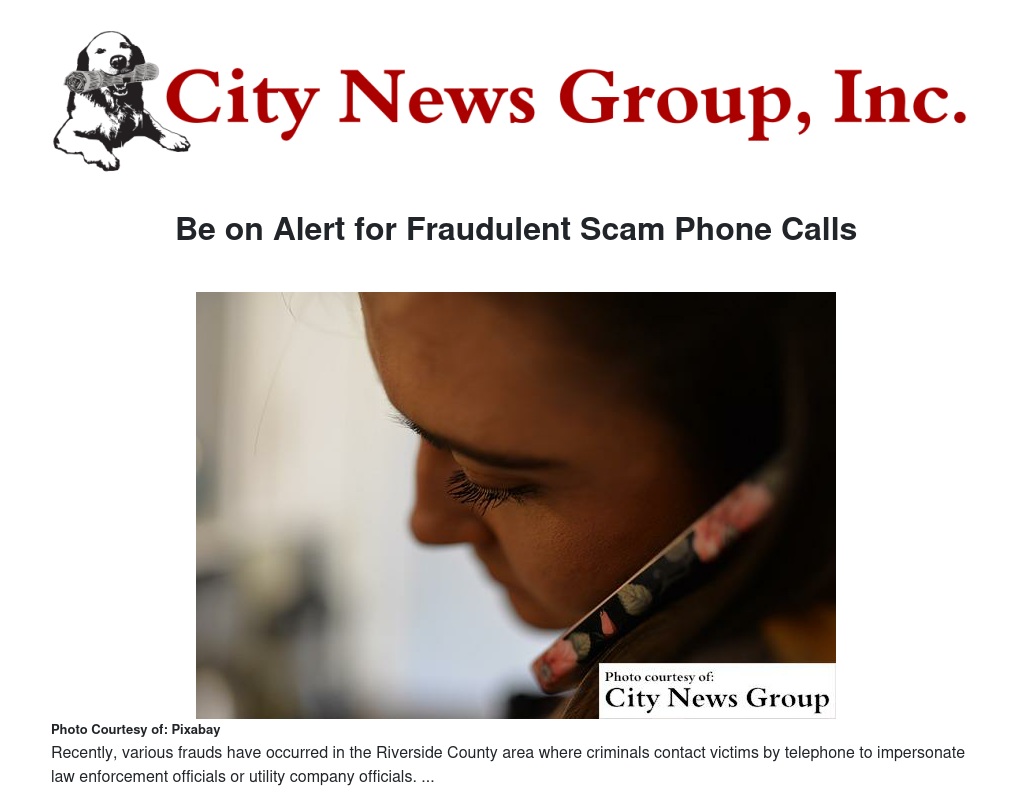 The Riverside County Sheriff’s Department would like to warn the public of Fraudulent Scam Phone Calls. Recently, various frauds have occurred in the Riverside County area where criminals contact victims by telephone to impersonate law enforcement officials or utility company officials.