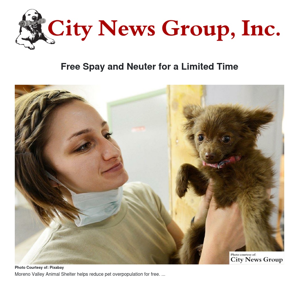 The Moreno Valley Animal Shelter is expanding the offer to provide free spay and neuter services for dogs and cats to Moreno Valley residents. The offer can be redeemed during a limited time with vouchers distributed on a first-come first serve basis at the Shelter. In the City of Moreno Valley, pet owners are required to spay and neuter their dogs and cats. This free spay and neuter program will help residents comply with the requirement and become a part of the ongoing effort to reduce pet overpopulation.