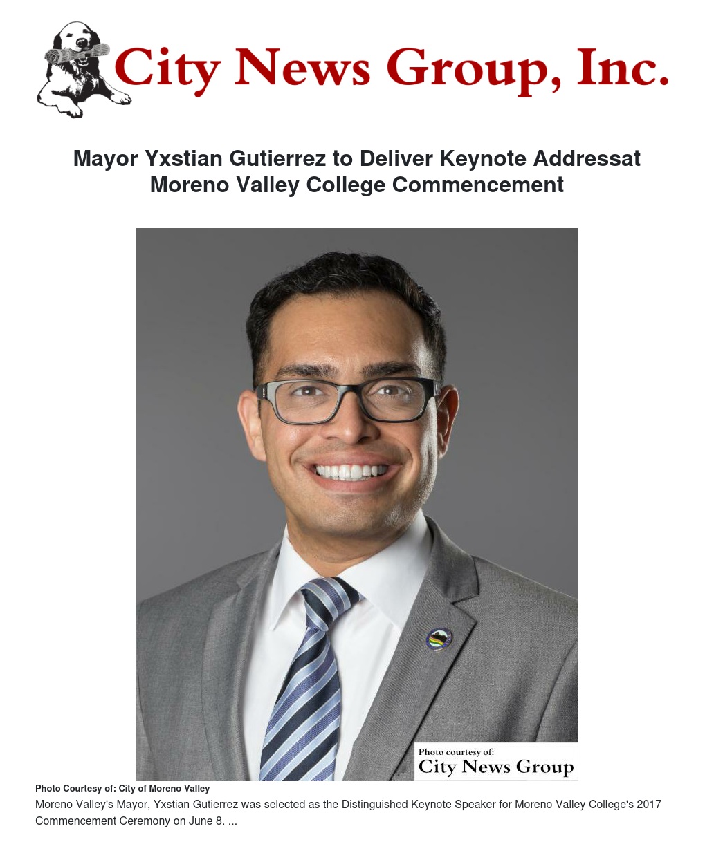 Moreno Valley>> Mayor Yxstian Gutierrez has been selected as the Distinguished Keynote Speaker at Moreno Valley College’s 2017 Commencement Ceremony on June 8.
