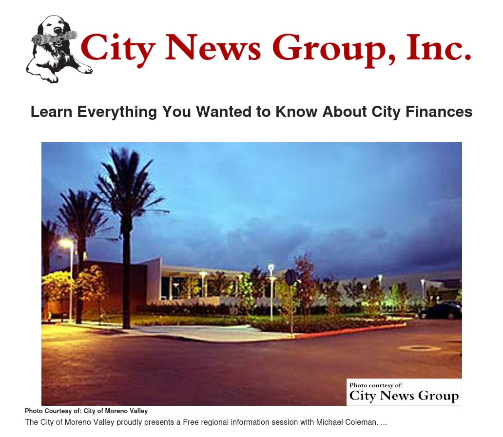 The City of Moreno Valley proudly presents a free regional information session with Michael Coleman, leading expert on California local government revenues, spending and financing.