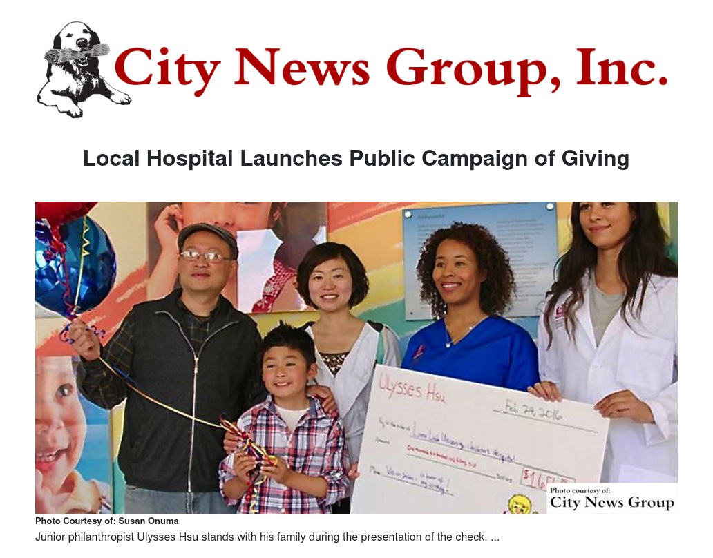 Junior philanthropist Ulysses Hsu was prominently featured during the groundbreaking celebration. Hsu asked friends to make a donation to the hospital instead of bringing him gifts and was featured both on stage and in a video during the program.