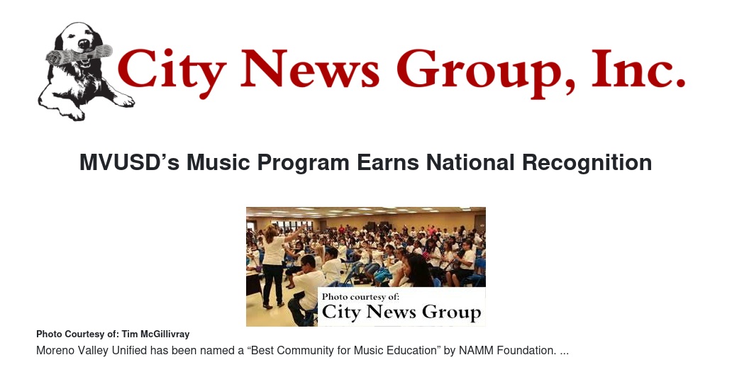 MORENO VALLEY >> In recognition of its outstanding commitment to music education, Moreno Valley Unified School District (MVUSD) has been designated a “Best Community for Music Education” by the National Association of Music Merchants (NAMM) Foundation. MVUSD joins just 476 other school districts across the country in earning the award this year, out of a total of more than 13,500 school districts nationwide. Only 12 school districts in California were so honored.
