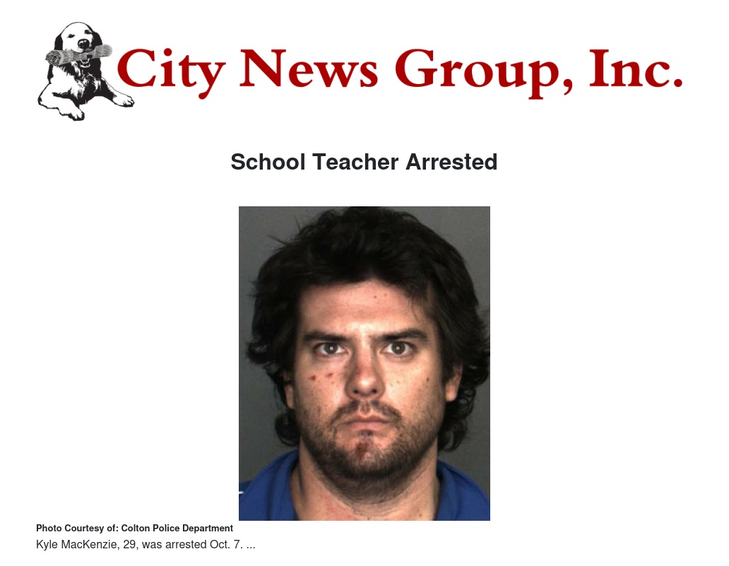 Jehue Middle School teacher Kyle Patrick MacKenzie, 29, was arrested around 10 a.m. on campus that morning and booked with the San Bernardino County Sheriff's Department for investigation of possession of a controlled substance, according to jail records. He was released late Oct. 7 on bail, jail records show.