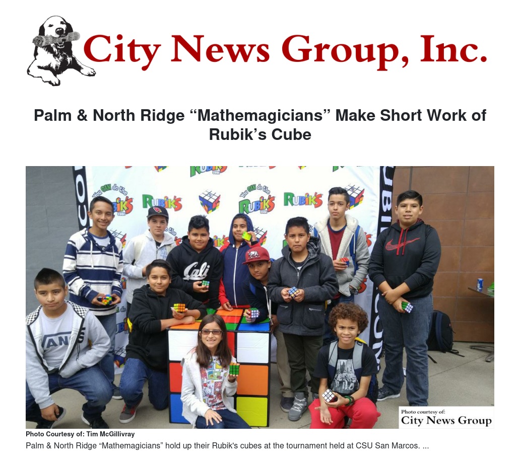 At a Rubik’s tournament held at CSU San Marcos, Palm seventh grader Enrique Perez led his team with a time of just 00:43:99. And Monica Moreno, a North Ridge fifth-grader, finished in the top five times for all elementary competitors.