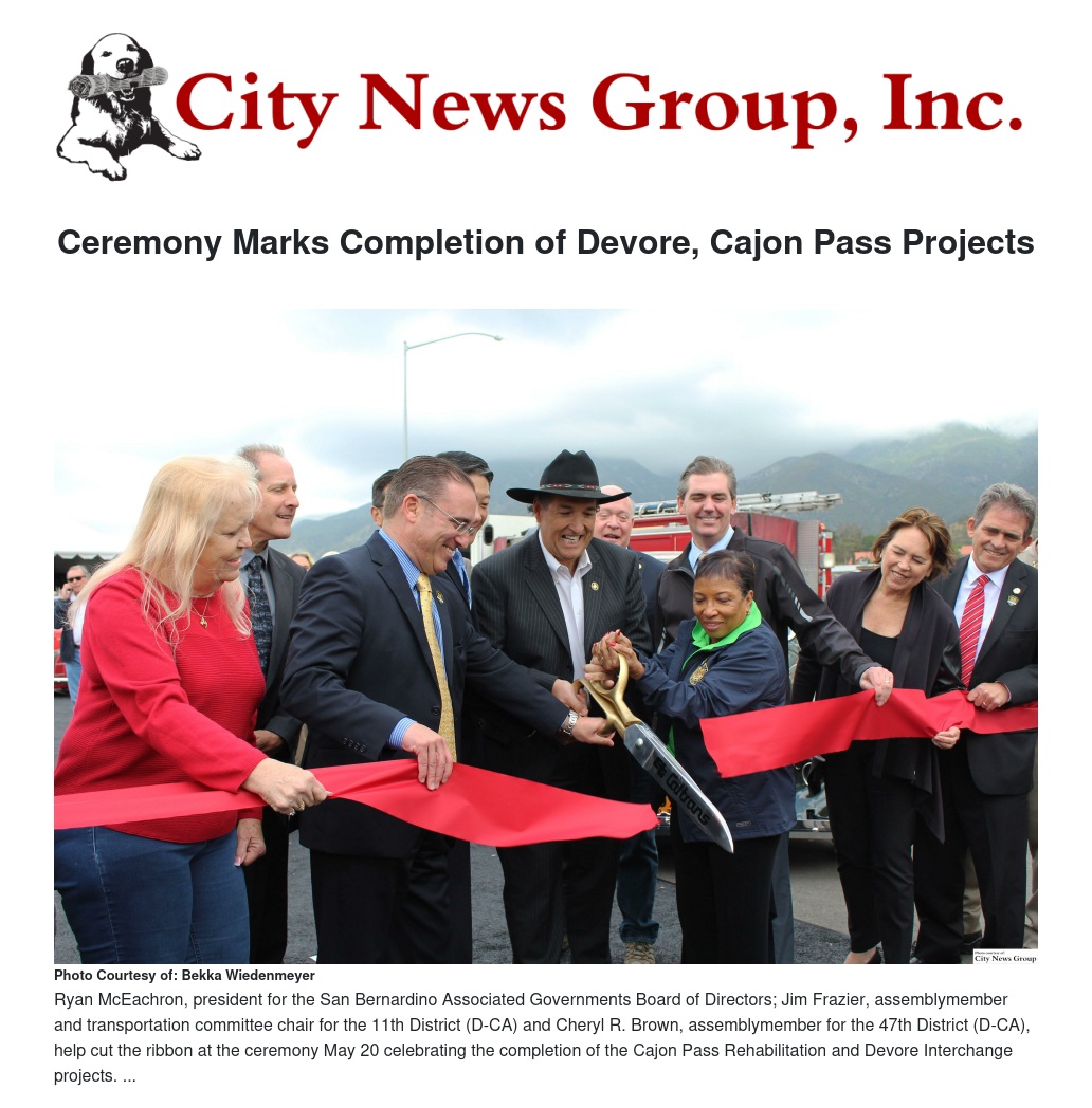San Bernardino County celebrated a major milestone May 20 with the ribbon-cutting ceremony for the completion of the Cajon Pass Rehabilitation and Devore Interchange projects, months ahead of schedule.