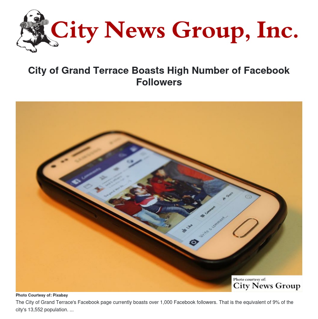 In a recent study, the City of Grand Terrace Facebook page, which can be located at www.facebook.com/CityofGrandTerrace/, was found to have over 1,000 Facebook followers. That is the equivalent of 9% of the city's 13,552 population.