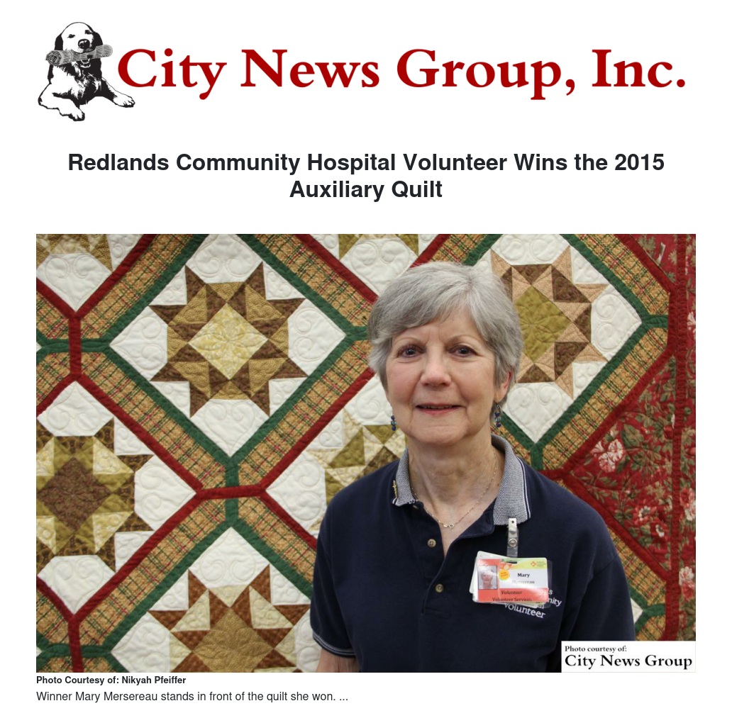 If Redlands Community Hospital was a quilt, the volunteer auxiliary would be the golden thread that holds all of the patches together. It is only fitting that long time pharmacy volunteer Mary Mersereau won this year’s auxiliary quilt.