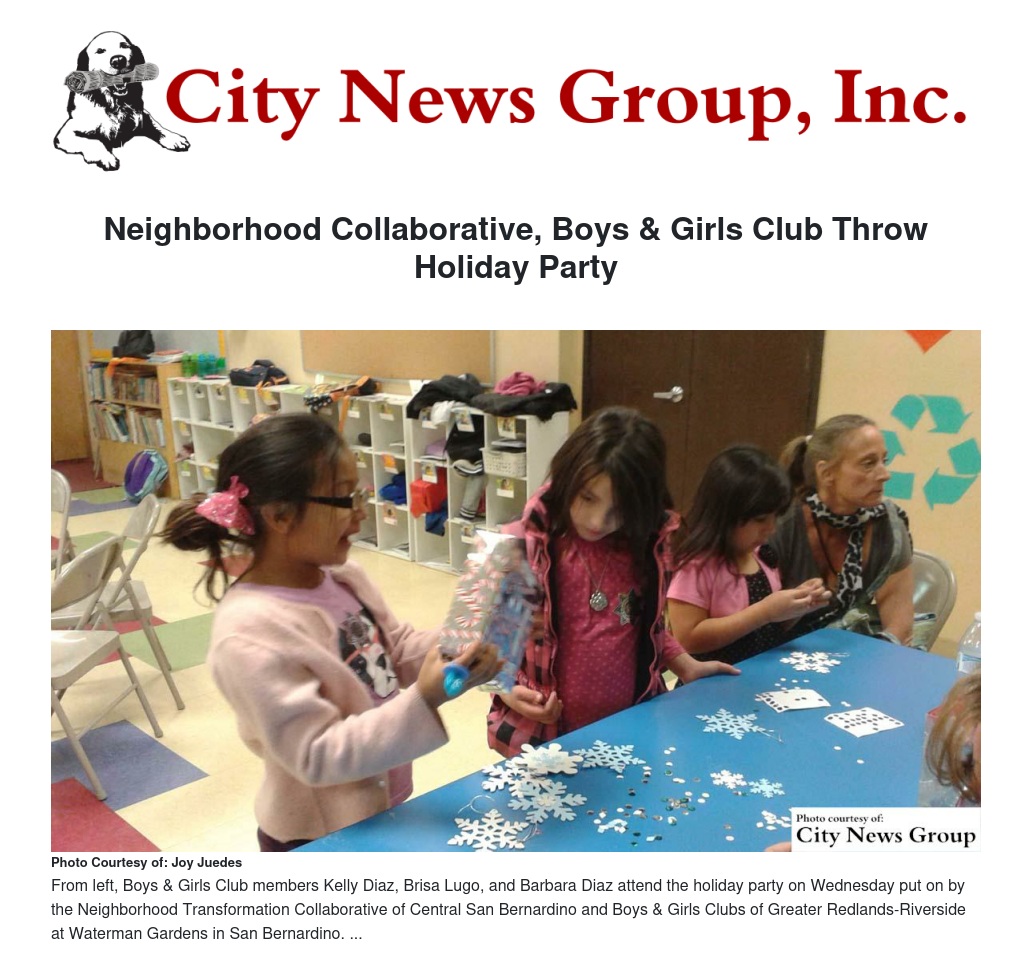 The Central San Bernardino Neighborhood Transformation Collaborative and Boys & Girls Clubs of Greater Redlands-Riverside held a holiday party and toy giveaway for kids at the Waterman Gardens public housing community on Wednesday, Dec. 16.