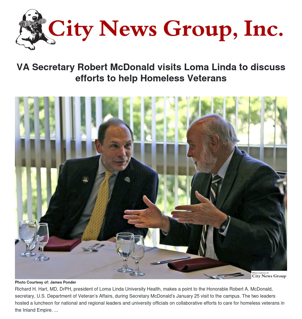 The Honorable Robert A. McDonald, secretary, U.S. Department of Veteran’s Affairs, visited Loma Linda University Health on Monday, Jan. 25, to meet with Richard H. Hart, MD, DrPH, and a group of national and regional leaders and university officials on ways to enhance collaborative efforts to care for homeless veterans in the Inland Empire.