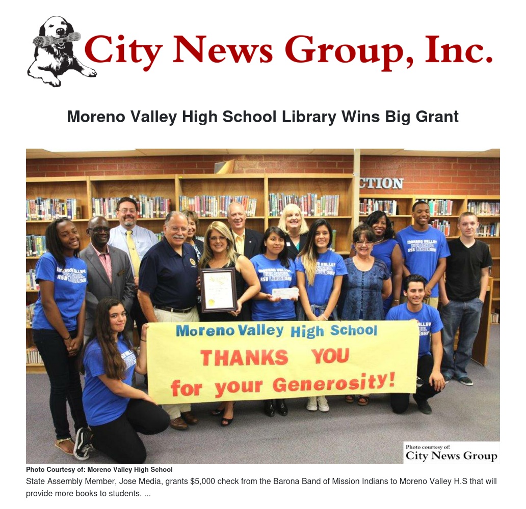 Assembly member Jose Medina dropped by Moreno Valley High School recently to present a check from the Barona Band of Mission Indians, in response to a grant request made by Moreno Valley librarian Teresa Mares.