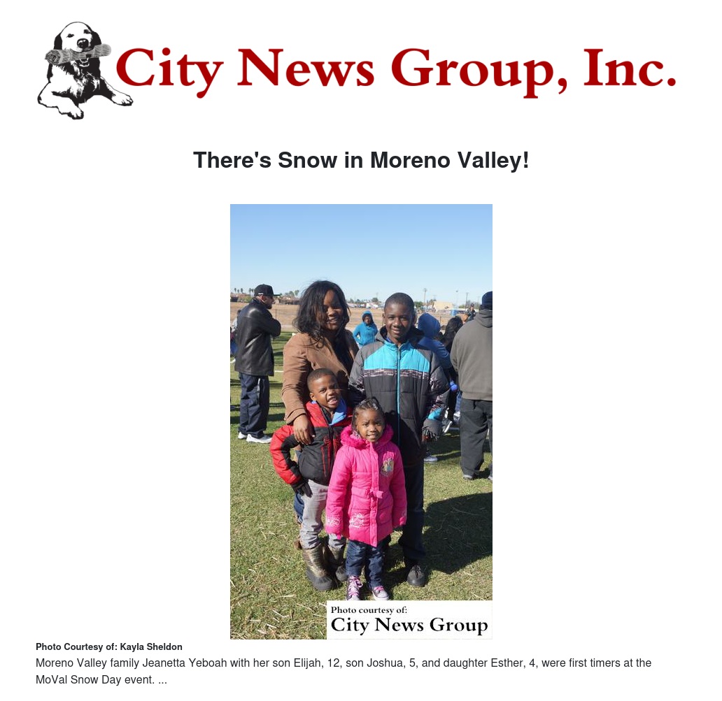 The Yeboah family of Moreno Valley came to the event with one goal in mind: to get in the Christmas spirit by playing in the snow. Although they are four-year Moreno Valley residents, this was their first time attending the Snow Day event, and they shared that they couldn't be more excited. Jeanetta Yeboah brought her three kids Elijah, 12, Joshua, 5, and Esther, 4.