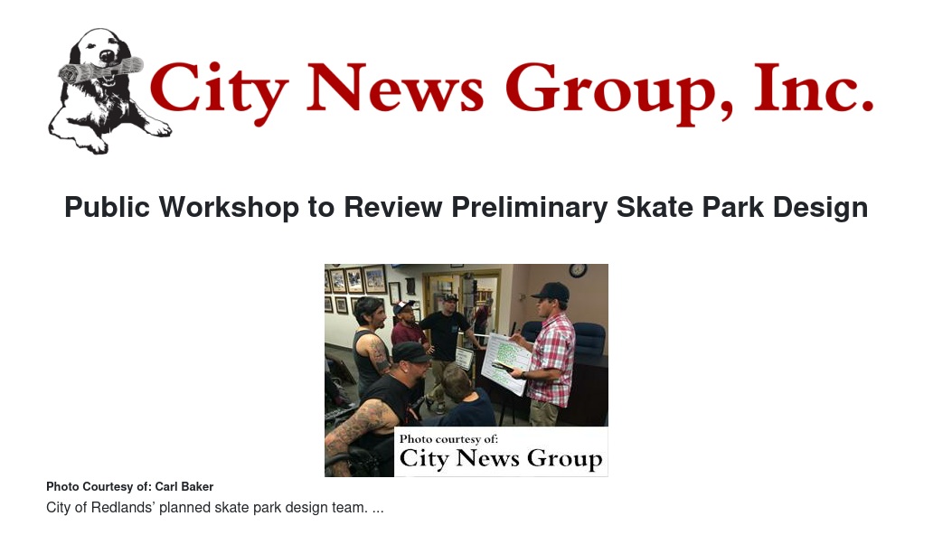 The City of Redlands will host the public design workshop with the California Skateparks design team at the Redlands City Council Chambers, 35 Cajon St. At that meeting the preliminary design for the skate park will be presented and community input from the workshop will serve to refine the design of the state-of-the-art concrete facility.