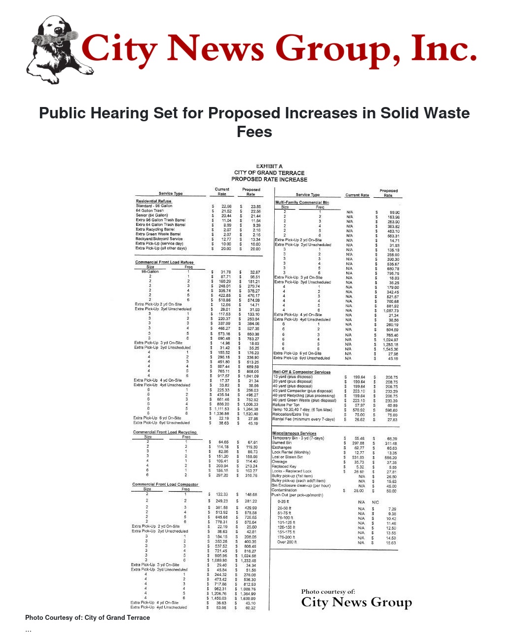 Grand Terrace residents recently received notification that the Grand Terrace City Council will hold a Public Hearing on Tuesday, Aug. 11, regarding proposed adjustments to solid waste and recycling rates and charges.