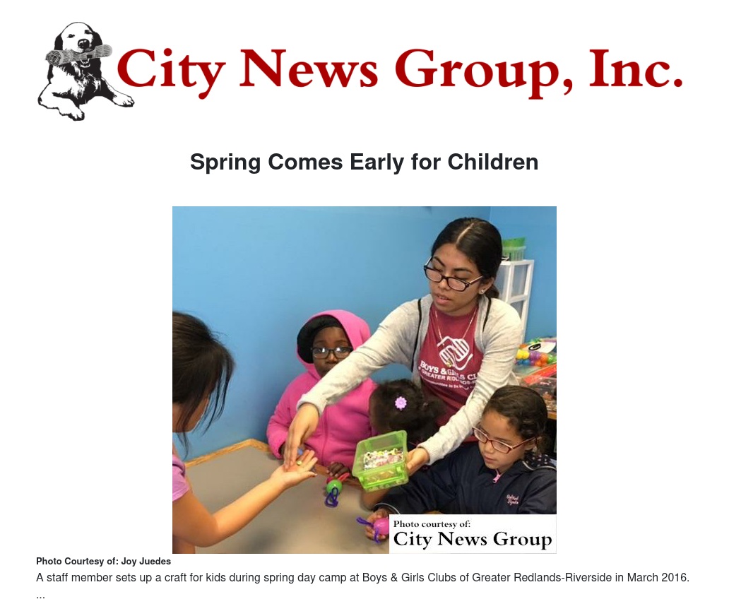 REDLANDS>> While some may be enjoying the winter weather, spring is around the corner and the Boys & Girls Clubs of Greater Redlands-Riverside is offering two weeks of day camp over spring break in March.