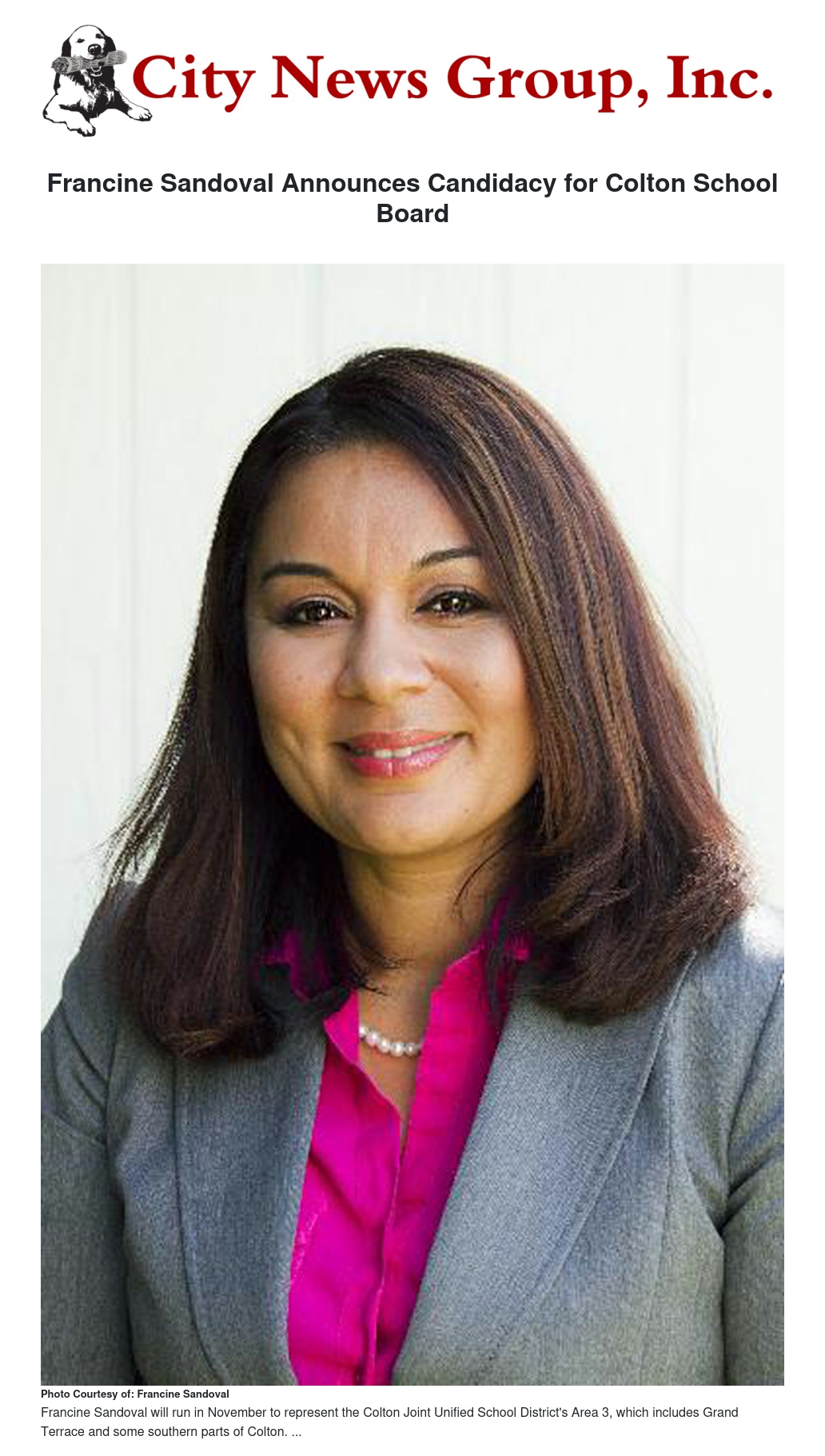 Grand Terrace resident Francine Sandoval announced her candidacy for a two year seat on the Colton Joint Unified School District (CJUSD) school board.