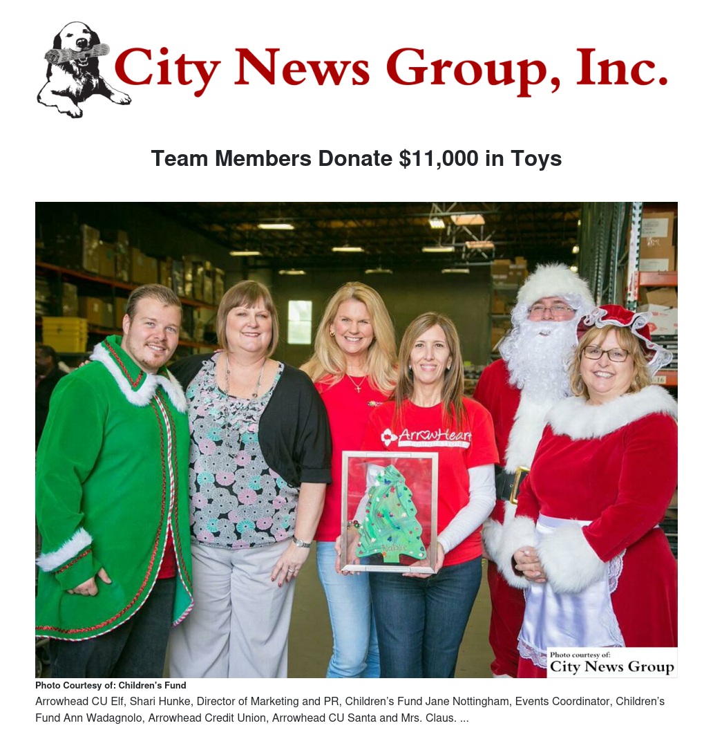 “Every year the number of children that need our assistance grows and we were worried about meeting their needs, especially in light of recent tragedies. But every year, Arrowhead Credit Union comes through –this year with more than 650 gifts,” said Jane Nottingham, Events Coordinator for Children’s Fund. “It’s amazing how Arrowhead Credit Union supports at-risk children in our community.”