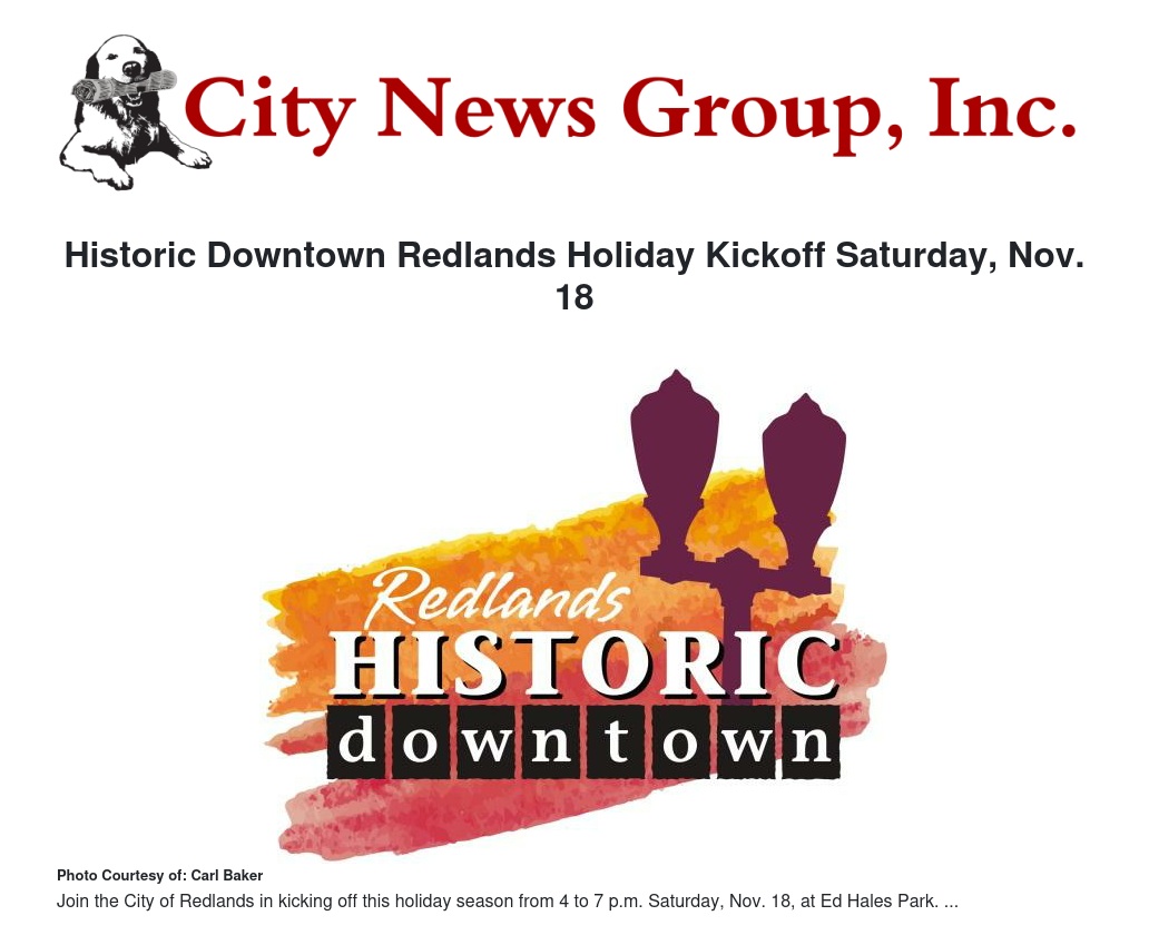 Join the City of Redlands in kicking off this holiday season from 4 to 7 p.m. Saturday, Nov. 18, at Ed Hales Park on the corner of Fifth and State streets in Historic Downtown Redlands.