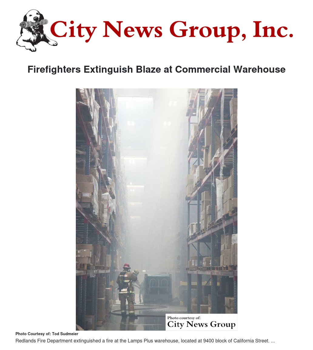 Upon arrival, crews discovered the large Lamps Plus warehouse to be filled with smoke. Reports from workers indicated that a propane powered floor sweeper was involved with fire.