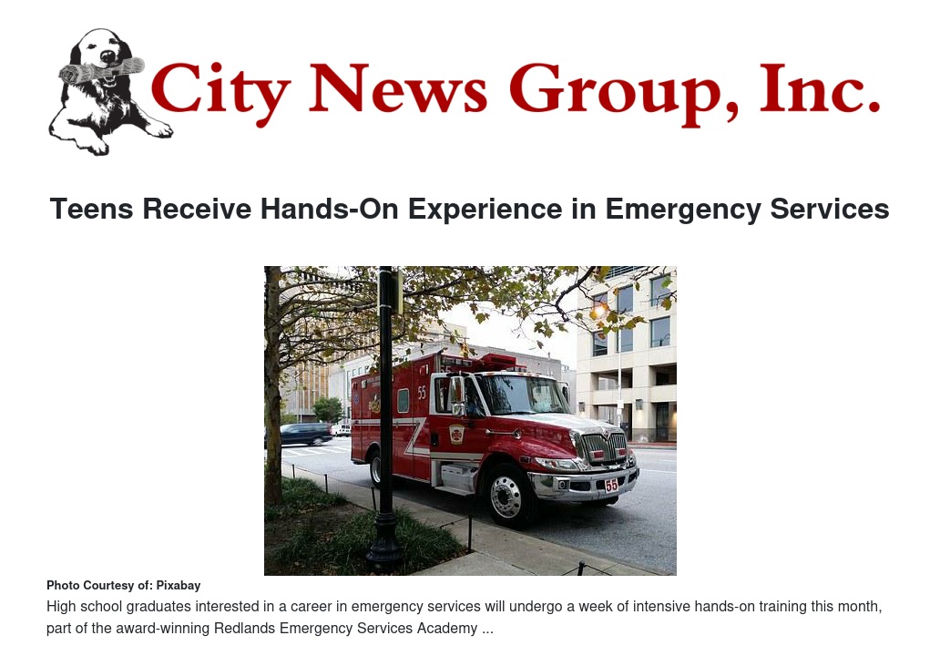 Redlands High school graduates who are interested in a career in emergency services will undergo a week of intensive hands-on training this month, part of the award-winning Redlands Emergency Services Academy. Each year, some two dozen local teens with an interest in a public safety career attend the annual Redlands Emergency Services Academy. The participants share temporary quarters for one week on the campus of the University of Redlands, are exposed to hands-on training exercises in fire and police operations, and are introduced to state of the art simulators. This program stresses the importance of a well-rounded education, as well as the value of an extended education to each of the teens in attendance.