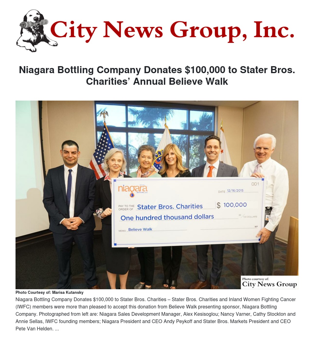 “The Believe Walk wouldn’t be the success that it is without the generous support from our vendor community, like Niagara,” commented Pete Van Helden, Stater Bros. Market’s president and chief executive officer. “Their long-standing support provides more than just critical, lifesaving services to patients in the midst of their battle. Niagara’s involvement gives hope and encouragement to all who are walking the journey with them.”
