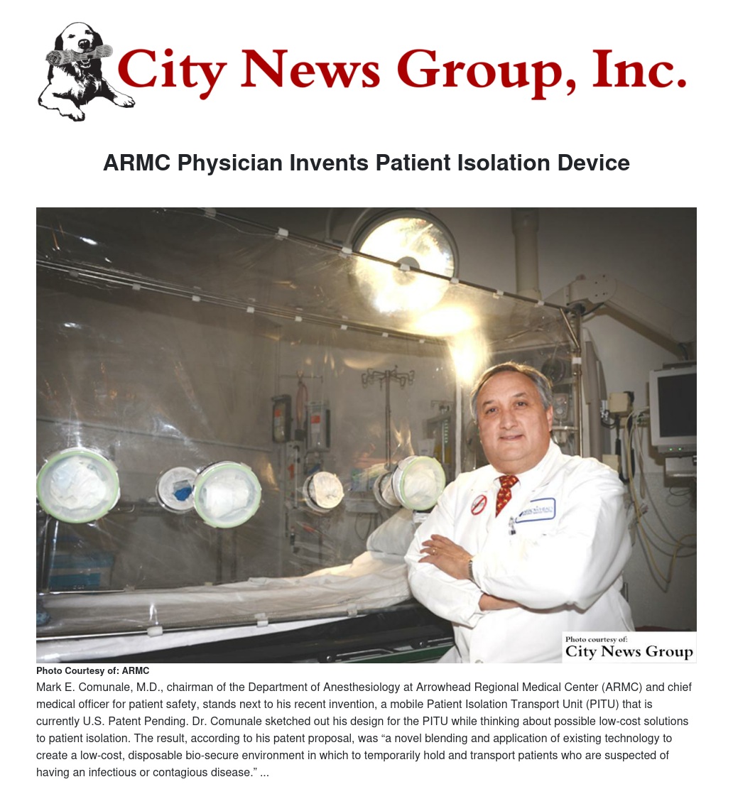Mark E. Comunale, M.D., chairman of the Department of Anesthesiology at Arrowhead Regional Medical Center (ARMC) and chief medical officer for patient safety, has invented a mobile Patient Isolation Transport Unit (PITU) that is currently U.S. Patent Pending. Dr. Comunale, who received his undergraduate degree from Boston University, his medical degree from Tufts, and taught for more than a dozen years at Harvard Medical School, came up with the idea for the PITU while trying to solve a practical problem.