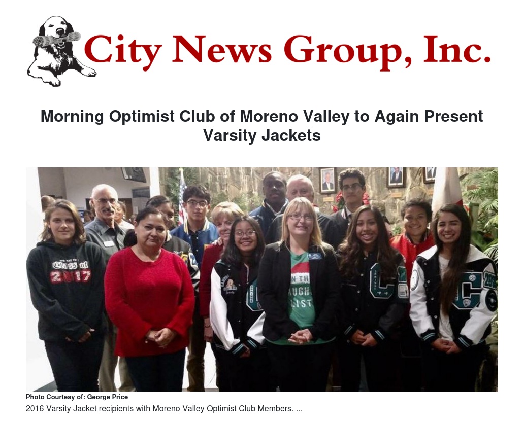 The Morning Optimist Club will for the fifth year in a row present Varsity Jackets to financially challenged student athletes at each of the Moreno Valley Unified School Districts (MVUSD) comprehensive High Schools. At the December 12th MVUSD school board meeting, the Optimist club will present 12 Varsity Jackets, to three students from each from Moreno Valley HS, Valley View HS, Canyon Springs HS and Vista Del Lago HS. The presentation will take place at the District Headquarters beginning at 7:00 p.m.