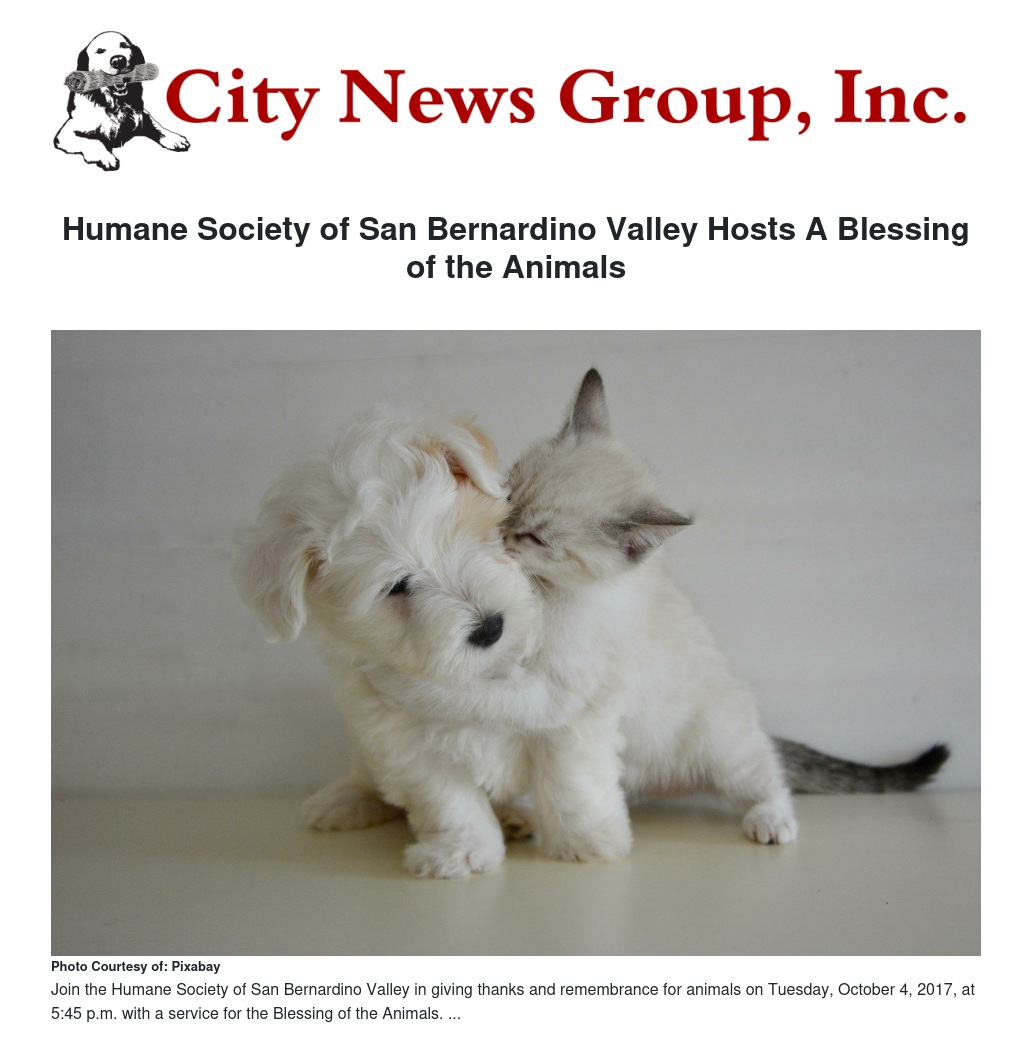 SAN BERNARDINO>> Join the Humane Society of San Bernardino Valley in giving thanks and remembrance for animals on Tuesday, October 4, 2017, at 5:45 p.m. with a service for the Blessing of the Animals.