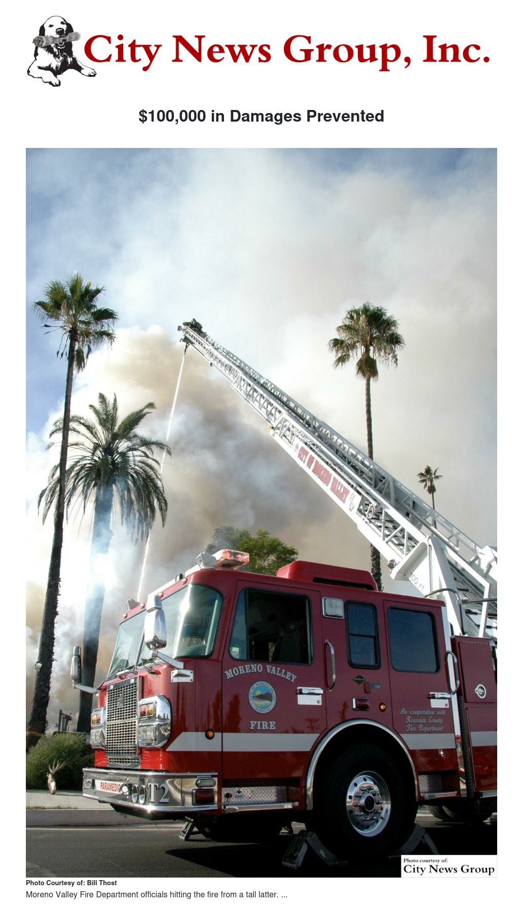 According to the Riverside County Fire Department, the fire was contained to 1/2 acre of a residential lot and resulted in no injuries. Firefighters kept the fire from spreading to adjacent structures. An estimated $50,000 of damages was caused by the blaze, and $100,000 of damage was prevented.