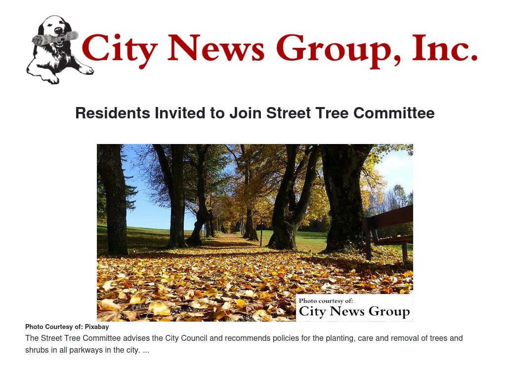 The Street Tree Committee advises the City Council and recommends policies for the planting, care and removal of trees and shrubs in all parkways in the city.